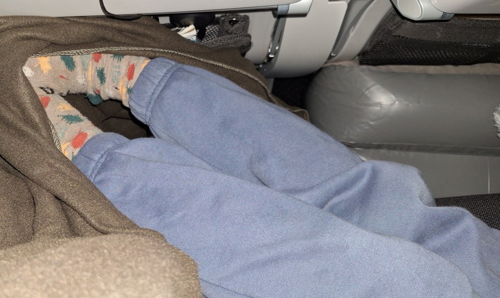 On the second leg, I was next to a 10- or 11-year old boy and his mum. Later on in the flight, he fell asleep and rotated so that his head was on his mum’s lap and his feet were on mine. For some reason, I didn’t mind this so much. Weird eh? When, later, his mum took off her eye mask and saw what had happened, she apologised.
