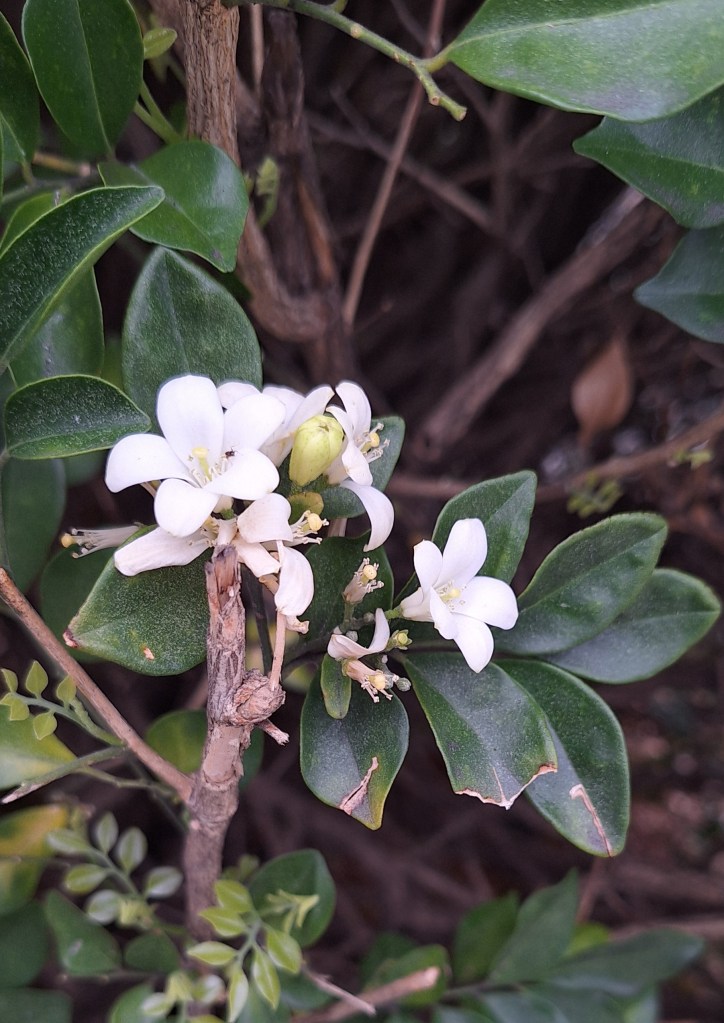 I found out later it’s not proper jasmine, it’s a Murraya paniculata, commonly known as orange jasmine or mock orange. Very nice scent, although I failed to pick up its notes of citrus.