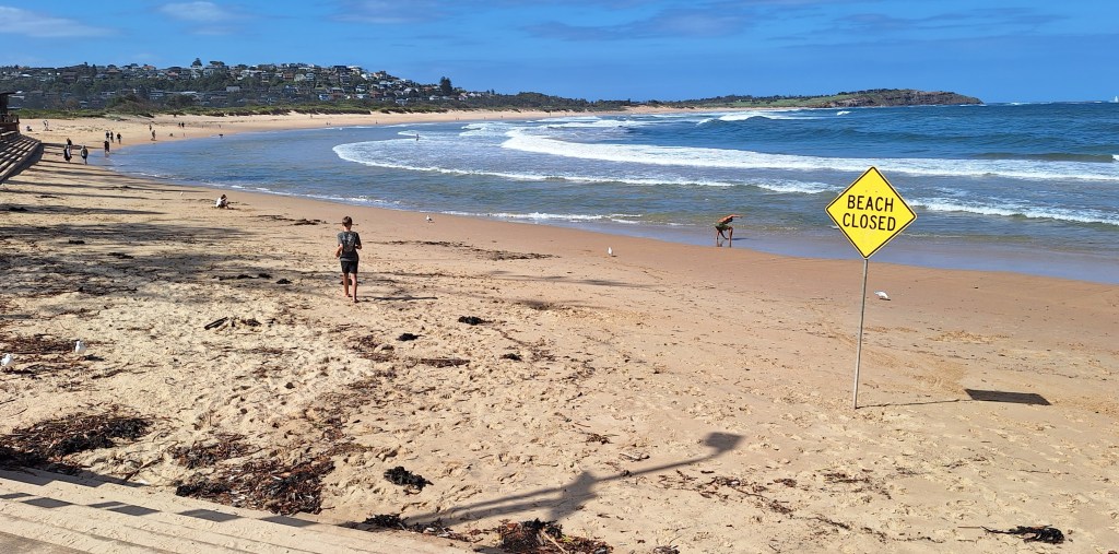 There were a few people on the beach despite the sign saying it was closed. But what the sign means is, don’t go in the water. This follows four recent shark attacks here and in Manly, caused by run-offs from the recent floods. Little fish eat the tasty effluent. Bigger fish eat the smaller fish. Sharks detect a feast nearer to shore. There was no danger of me venturing into the Pacific Ocean on this occasion, in any case, it was just too rough.