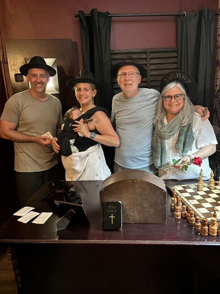 The music from The Godfather played throughout, and I for one felt it was time to watch those films again. There are no photos from the escape room itself, of course, we can’t reveal the secrets. We escaped with seven minutes to spare: Liesel and I were very glad to have Brent’s and Helen’s younger brains ticking over a bit faster than ours.