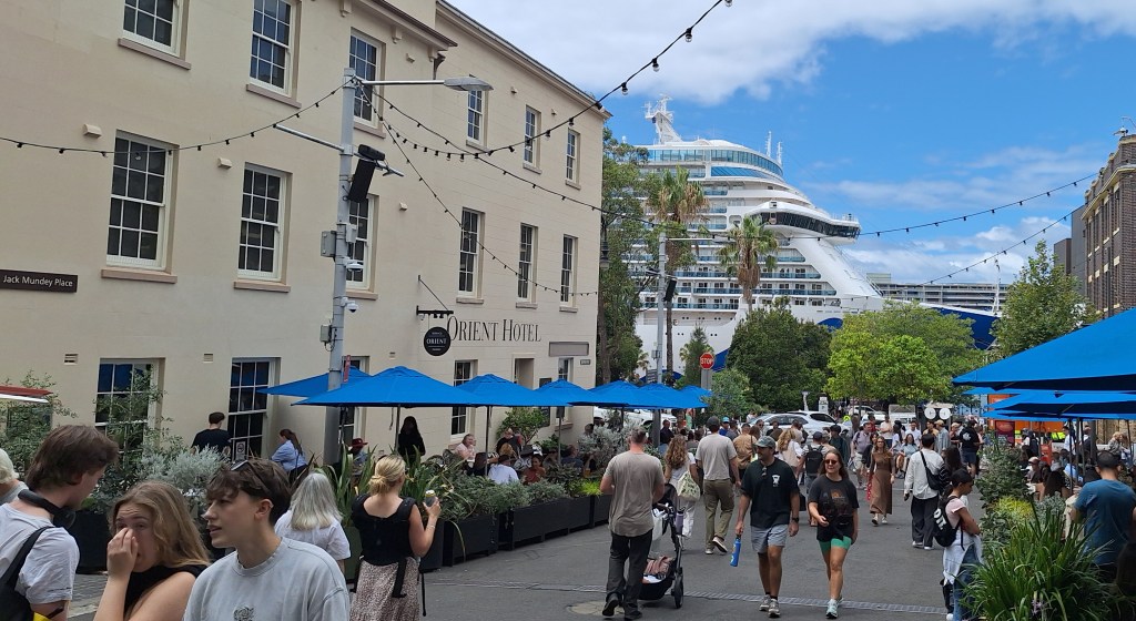 We wandered around Circular Quay to the Opera House where we enjoyed lunch, outside, in the shade, avoiding the bright sunshine. Food and drink was ordered by QR code and disappointingly, the servers just walked our food and drink to the table, no roller skates involved.