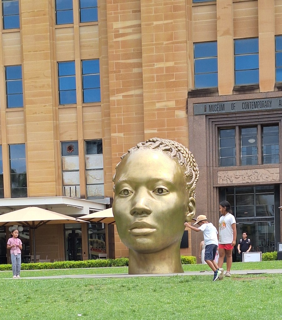 This sculpture caught my eye outside the Museum of Contemporary Art. The 1.5-tonne, 3-metre-high head of a woman is cast in golden bronze.