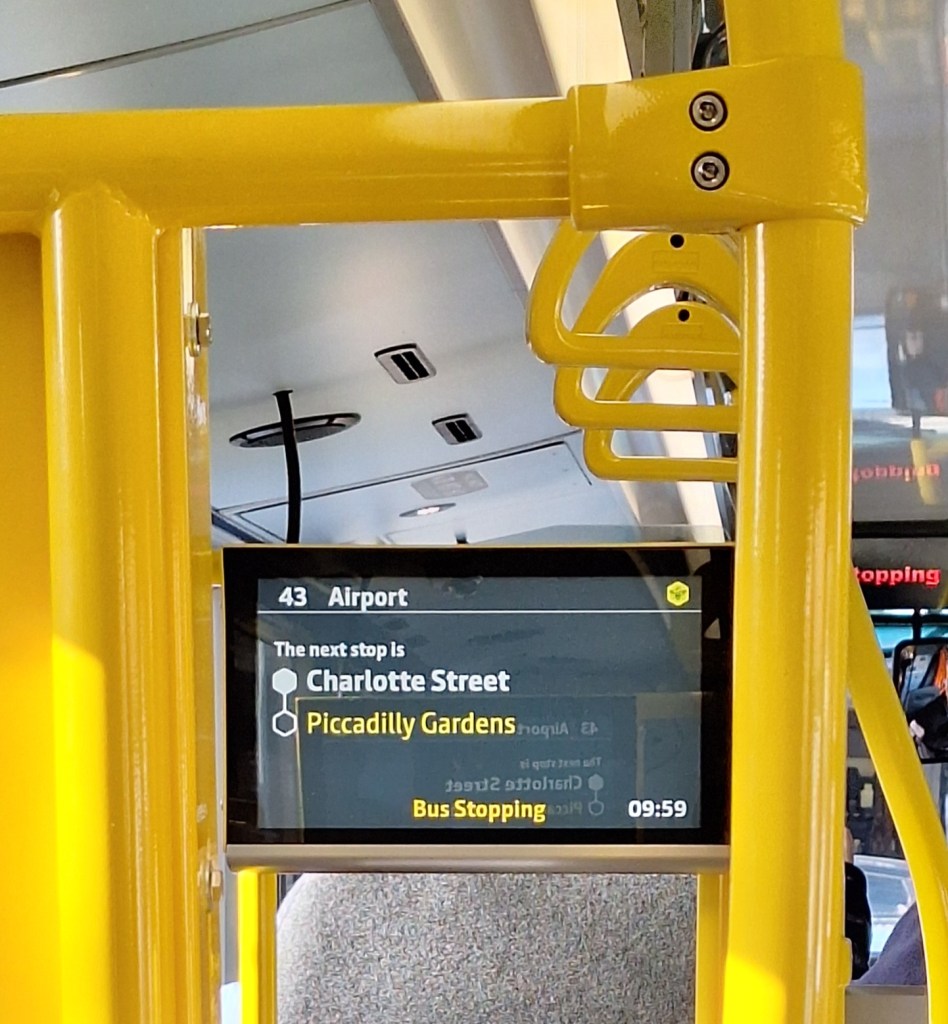 The display on this bus wasn’t very helpful. The Airport and Piccadilly Gardens are in opposite directions, being the two termini for route 43. Still, I got to my destination OK.