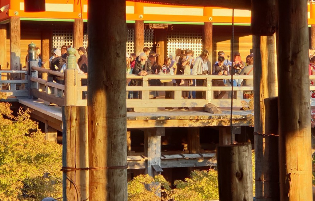 Kiyomizu-dera Temple is at the top of a long, narrow, uphill road, and most people kept to the left. A nice mix of vistors such as ourselves and local people, dressed in gorgeous, colourful kimonos.
