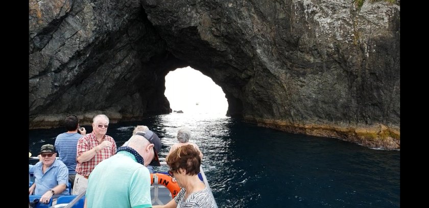 We sailed on to Motukokako or, as it’s known, the Hole in the Rock. We passed by Cape Brett Peninsula, Rakaumangamanga, on top of which is located a lighthouse. It is now unmanned and the light rotates in an almost frictionless bath of mercury.
