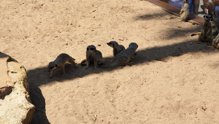 Two of the meerkats were having a play fight, but they and the others were making the best of a very small patch of shadow in their enclosure. It was too hot even for meerkats.