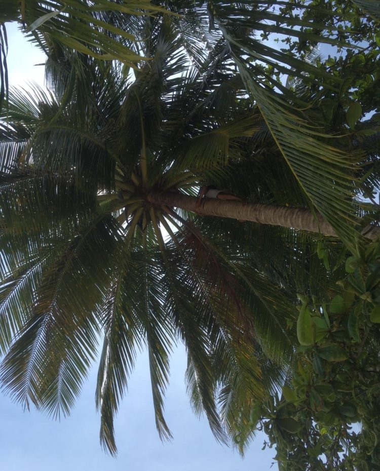 One day, our friends from the north suggested we more our sunbeds because dead, sharp leaves were falling from the tree. Well, I thought, at least it’s not coconuts. A while later, a couple of members of staff came by and asked us to move. We did. One of them climbed the tree, straight up, no messing, and pulled off a couple of large, dead branches. They landed on the ground with a bit of a thud.