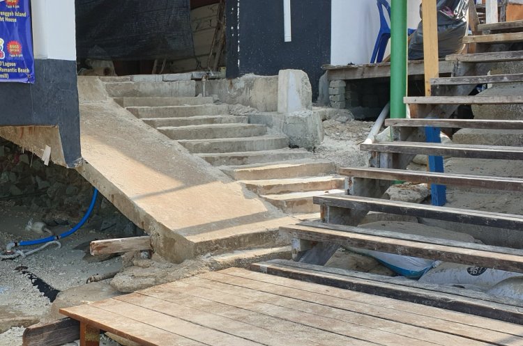 We haven’t seen so many wheelbarrows since we were in Dublin’s fair city, where the girls are so pretty, almost a year ago now. They’re fairly ubiquitous here at Tuna Bay Island Resort. Our luggage was brought from the boat onto land in a wheelbarrow, wheeled along the narrow jetty, even through the water, as the tide was in. All the housemaids, or cleaners, use wheelbarrows to carry their paraphernalia. It all makes sense, they’re weatherproof and easy to use. Where there are steps, they’ve built ramps in some cases. Quite a steep ramp and then, when you get near the top, the gradient increases sharply. Not the most wheelchair or buggy friendly of places.