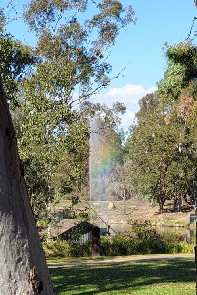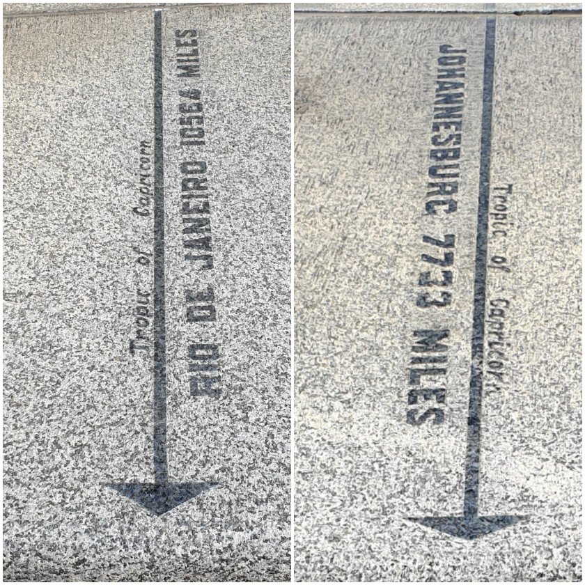 When I reached a stopping point, I went to meet Liesel and was delighted to find this sundial, with its unorthodox orientation and gnomon placement. It told the right time as far as I could tell, taking into account the equation of time and daylight savings, but I could see no reason why it was set up this way. It was erected in celebration of Australia’s Bicentenary in 1988.