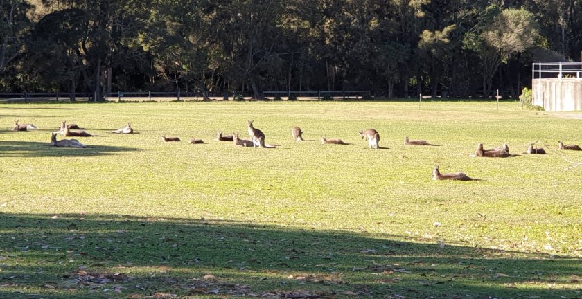 Just when you’re thinking, ooh, we haven’t seen any wildlife for a while, we turn a corner in Kioloa and find a field full of kangaroos relaxing.