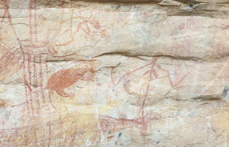 Although an Aboriginal artist is not supposed to touch up or improve on someone else’s work, after a time, a painting can be overwritten with a new one, a palimpsest. Experts can tell the various ages, and see how the ancients’ lifestyles changed over time.