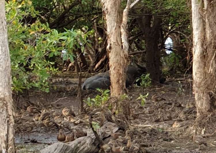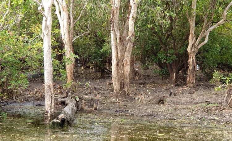 This is why the place was closed to casual visitors like us, we thought. But no. The real reason is that a 4-metre long crocodile had taken up residence in the flooded part of the car park. Everybody breathed in sharply at this news. We were very carefully shepherded from the bus to the jetty which was enclosed in very thick metal fencing, and then onto the boat.