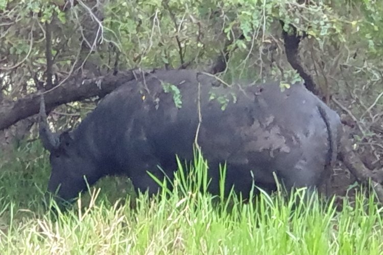 After seeing the warning sign yeserday about the presence of buffalo, we knew we wanted to see one. And our wish came true. Damo spotted one hiding behind a tree, having a rest, chilling out, eating grass.