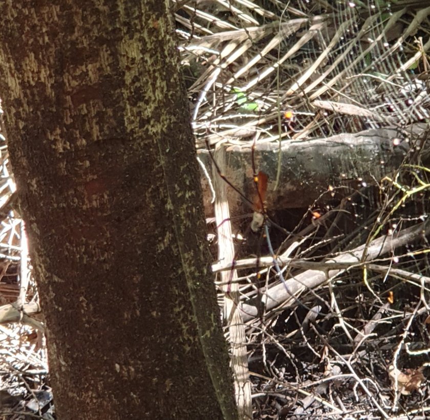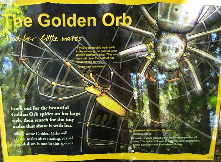 The sign told us to look out for a Golden Orb Spider. Well, we found one quite easily, because it was being photographed by a few other people. It’s huge! There were some small, golden normal sized spiders on the web too, but the large one was magnificent. This is one of those rare times when I wish I had a real camera with manual focus. The spider is out of focus in all of my pictures: very disappointing.