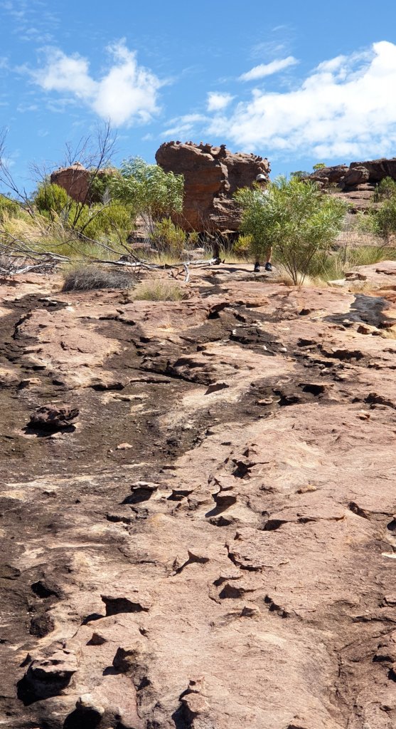 The rocks reveal the course of flood water cascades during the Wet. Black algae grows where the water flows, then it dries out and leaves what looks like sooty stains when it’s dry.