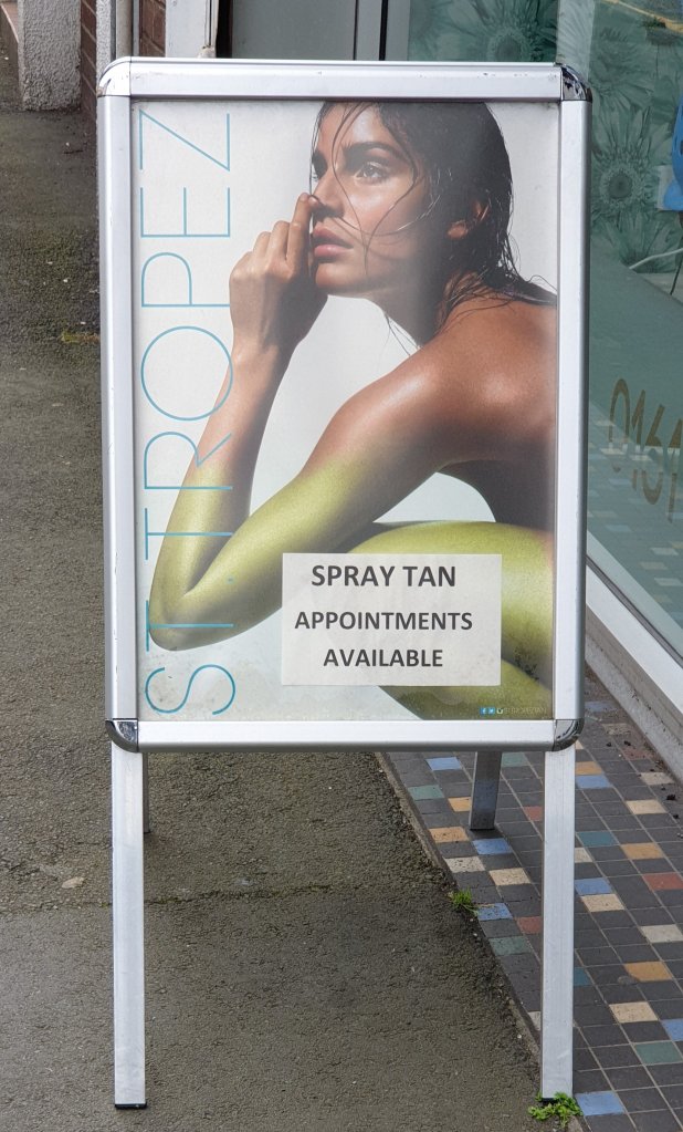 There are lots of beauty parlours, nail salons, hairdressers, tattooists, body piercers and other related establishments close to where we live here in Northenden. One place I won’t be visiting for my next spray tan is only a five minute walk away.