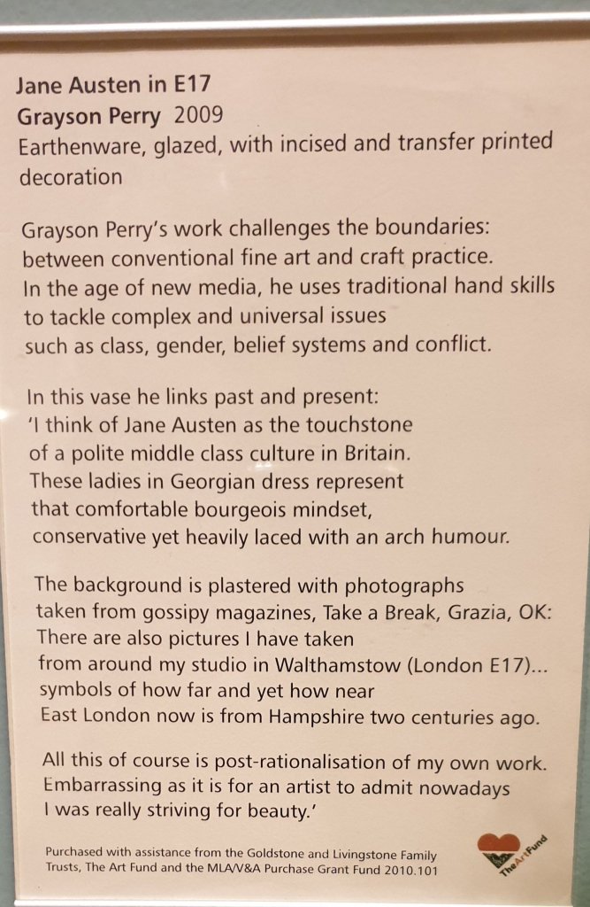 We’ve seen Grayson Perry on TV and heard him on the radio, but I don’t think we’ve seen any of his artwork before. This vase is fascinating and very colourful: I could have looked at it for ages.