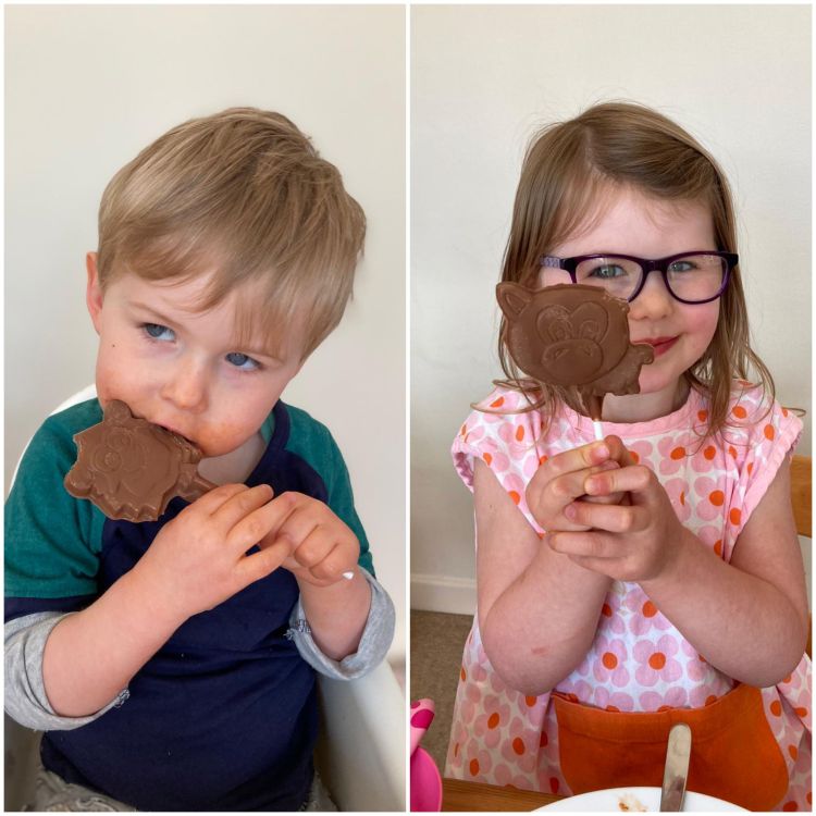 Both William and Martha made chocolate lollipops in the shape of animals. William was happy to share: Mum could have a tiny little bit.