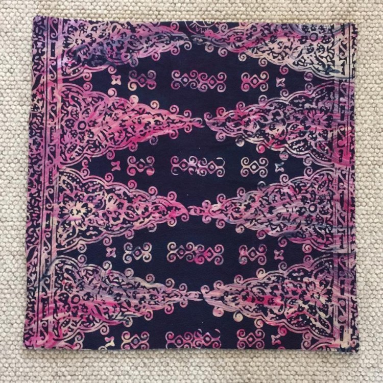 And the latest creations from Liesel are the front and back of a cushion. We haven’t got the stuffing yet, but it’s on order. What did we stuff Cyril with, then? About 10% of the shredded paper that I produced a couple of weeks ago, naturally.