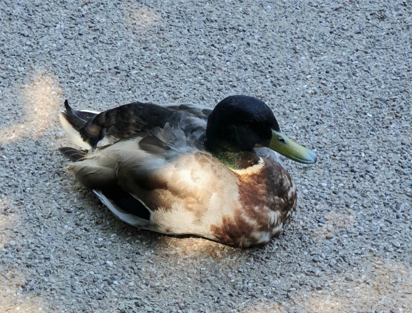Standing outside our luxury block of luxury apartments, looking up at the blue sky through the oak tree’s foliage, in a slight breeze on a hot day, is delightful. One branch is dead and bits of it fall down now and then. Maybe it was malnourished (oof) when it was younger.