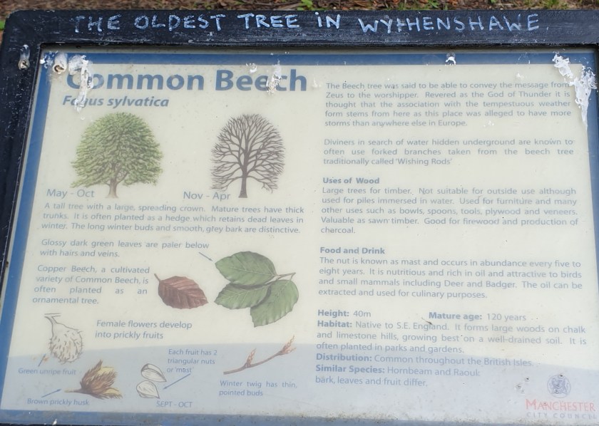 According to the annotated sign, this beech is the oldest tree in Wythenshawe.