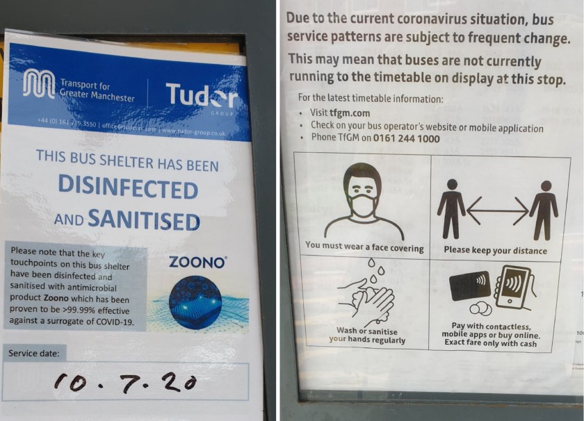 The bus stop has been cleaned and at last, we now know for sure that we’re supposed to wear masks on public transport, and that we can pay with a contactless card or phone.