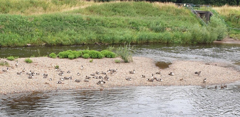 One morning this week, I was woken by what I thought were hundreds of geese flying round and round our house. I’ve no idea how many there were, really, but a couple of days later, we saw quite a few had set up camp on the island in the stream.