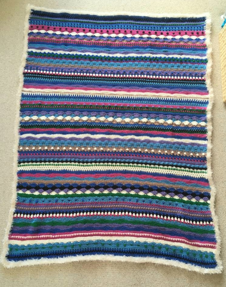 I was especially impressed with the fringe around the edges, a very professional finish. Liesel has now started on a second one, with a different combination of yarn colours.