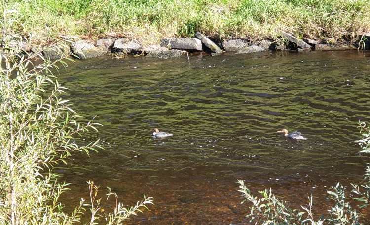We haven’t seen these ducks before, and we’re not sure what they are. They have the brown head of a pochard, the long bill of a merganser and the grey back of a widgeon. And in flight, the silhouette of a cormorant.