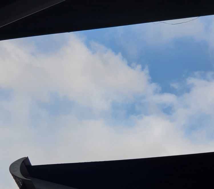 It started raining, absurdly loud on the awning above: I was worried about having to walk home in the shower, but it only lasted a minute or two. The newly washed blue sky with its clouds was reflected in my coffee.