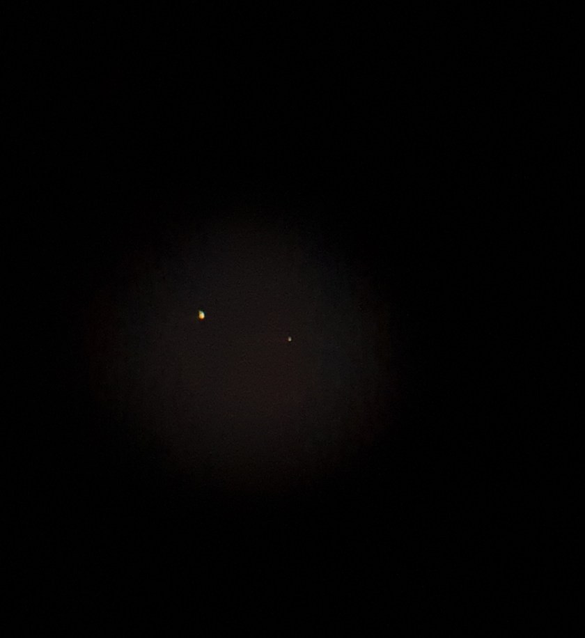 The big astronomical event of the week was the conjunction of Jupiter and Saturn, appearing close to each other in the night sky. Usually we can’t see anything interesting in the sky because of the thick layers of cloud, but on the day before the closest approach, we were met with clear blue skies. So, just after sunset I looked southwest and saw the two planets. It took a while to convince myself that it wasn’t just the headlights from a passing aeroplane, but hooray, I saw the two largest planets in the solar system. I tried to take a picture with my phone, it’s obviously not the best picture taken of the event.