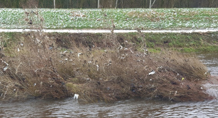 The river was flowing fast but it was much lower than at the height of the floods last week. Lots of detritus had flowed downstream of course, plenty of trees and branches and so on deposited by the high water. But the ugliest sight probably is all the plastic caught in the trees on the island and tangled in the vegetation on the river banks.