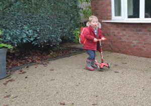 And William insisted on wearing his backpack while scootering outside the house: maybe he thought he’d be going further away from home. He was doing sums. Just turned three years of age and he can do simple arithmetic. And he loves saying two and two equals four rather than just plain old ‘is‘.