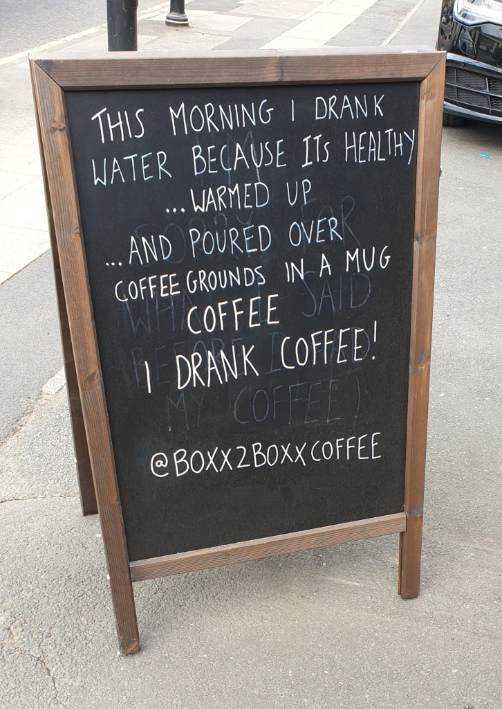 So I sat inside Boxx 2 Boxx and watched the torrential rain for a while. I had a nice chat with Dan, the choirmaster and sometime fellow Radio Northenden presenter, and with Jill and Shelly, the proprietors. Jill, by her own admission, isn’t yet very good at drawing a nice picture on top of a frothy latté!