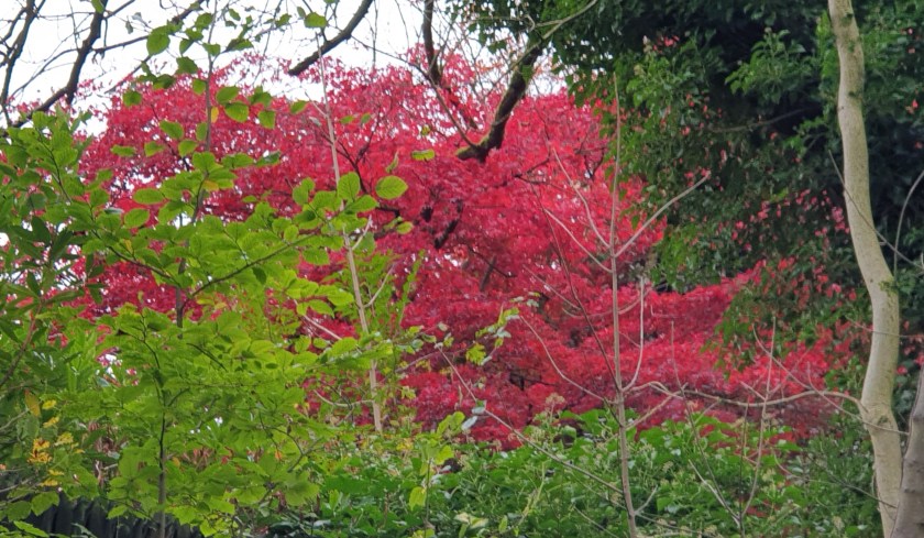 Autumn colours, brown and yellow were definitely prominent today, so this splash of red from an acer was a surprise. Hard to miss, really.
