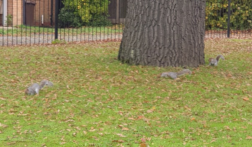 We often see a squirrel on or close to the oak tree outside our flat, but there was a whole herd of them when I returned from a walk with the Northenden group of walkers.