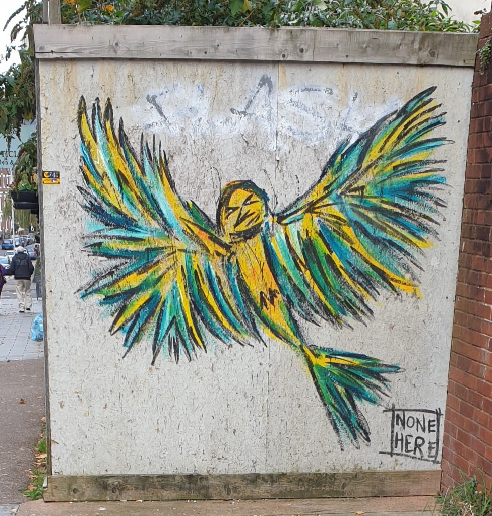 Steve McCraken has decorated the town liberally with these attractive birds. No idea why he uses the name ‘None Here’. And what a shame someone feels the need to spoil it with their own tag.