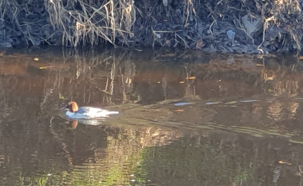 We saw a robin then we saw a man with a big zoom lens taking pictures of a different robin. He told us there were goosanders around the bend, and indeed we did see a couple of what I thought were mergansers.