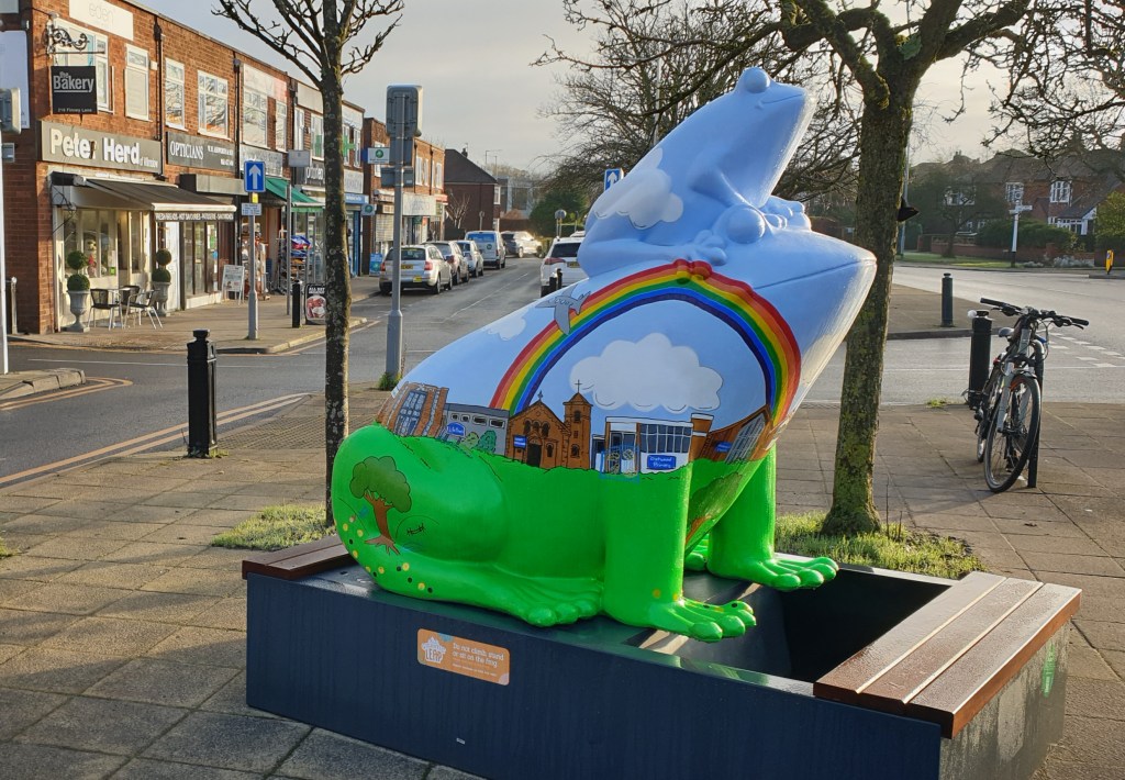 Liesel and I drove to Heald Green where, for the second week in a row, she took a PCR test for Covid. A negative result means that she can fly to Alaska. While waiting, I found a couple of frogs. I didn’t realise these amphibians were still adorning the streets of Stockport.