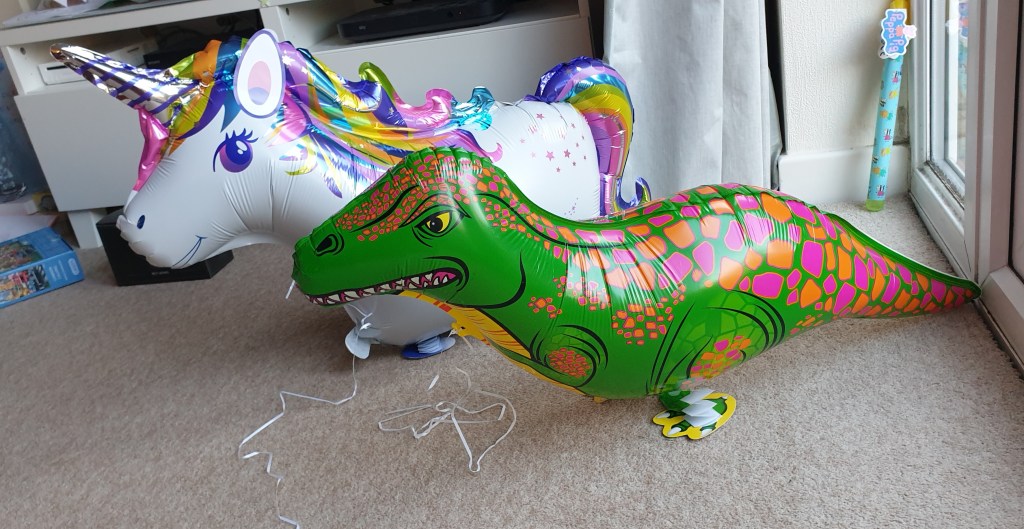 And finally: Card Factory back in Cheadle where a couple of balloons were inflated: a dinosaur for William and a Unicorn for Martha.