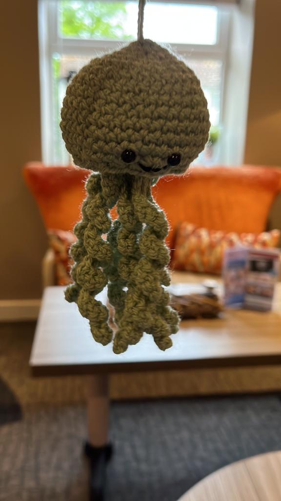 All week, in fits and starts, Liesel has been crocheting a jellyfish. She attached the final tentacles this evening and gave it to Amy who was delighted.