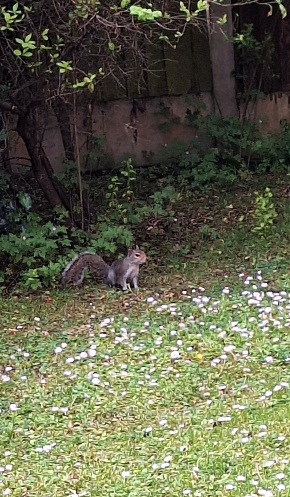The squirrel greeted me when I arrived at home. For years, his instinct has been to run up the tree whenever he sees me. Maybe he thought I couldn’t see him, under the bush. Even when I accidently let the front door slam shut, he didn’t budge.
