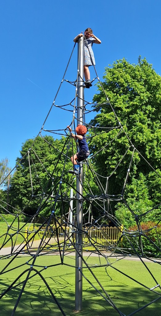 They both reached the summit of the climbing frame, again, something I’m not sure I could do, but only because it’s in a childrens’ playground, not for any other reason such as cowardice or chickenry.