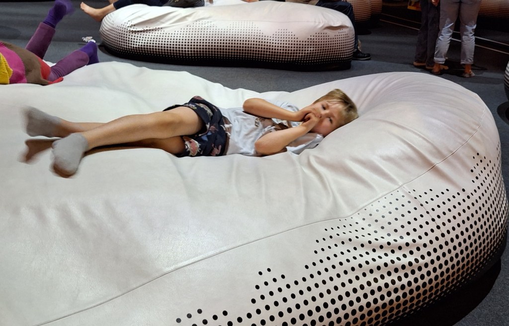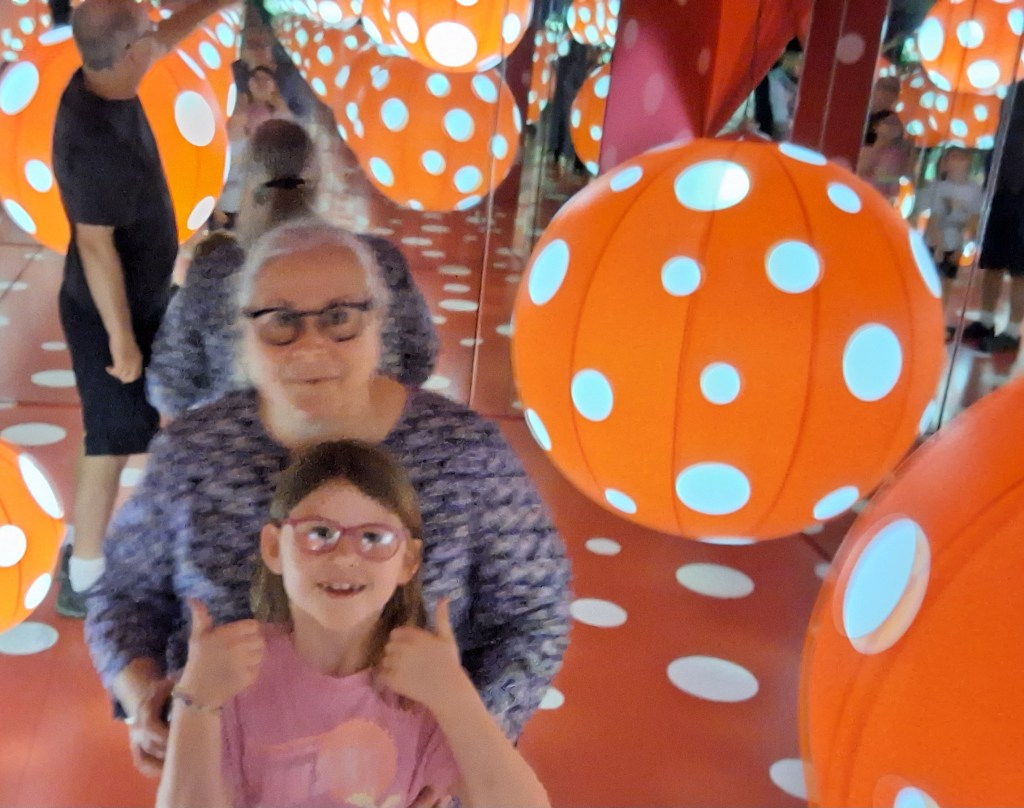 The queue for the Infinity Mirror Room was much longer than last time. I said I’d wait in line, and it was exciting to reach to point at which the wait was 30 minutes! Meanwhile Liesel and William looked at some other exhibits, Martha wandered round, doing handstands and somersaults.
