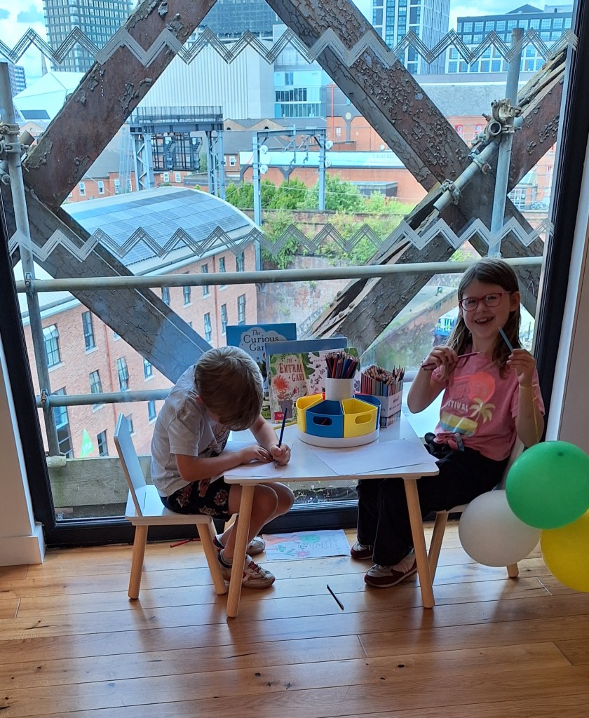 We were up early to collect the children. The plan was to go into Manchester by bus, but after waiting for over twenty minutes, we resorted to Plan B. We drove to Sale Water Park and caught a tram into Manchester. There have been strikes on our local buses, but we shouldn’t have been affected today. William’s first response on being told we would travel by tram was, ‘I don’t like trams’. As soon as he saw one, ‘Oh, I really love trams’. It was their first journey by tram, although we didn’t realise that at the time. No seats available at this busy time of day, and presumably many other people whose buses had gone AWOL, so we had to stand, and the children were just as excited about that as they were about being on a tram in the first place! Martha was also fascinated when the tram went along a road, with cars and everything.