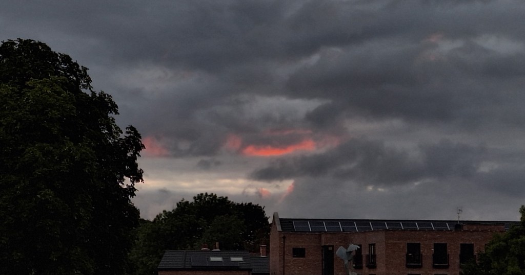 Later in the week, we went out for a twilight walk. Big mistake. Electric bikes going up the road at 40mph. Cars turning the corner at 90mph, tyres screeching and squealing, just missing other cars half parked on the pavement. And then, by the river, swarms and swarms of small, annoying bugs. As the Sun sets of course, the colour drains from the vegetation, literally ‘fade to grey’. But there was one small splash of colour.