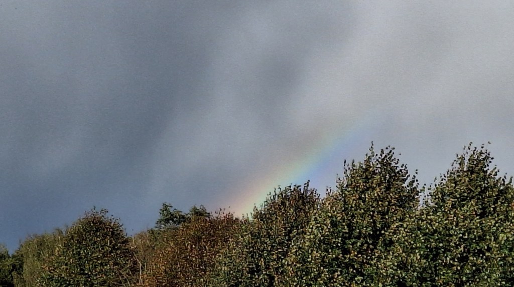 I mentioned colour, and you had to be quick to see it, but the very tip of a rainbow appeared above the trees, over there.