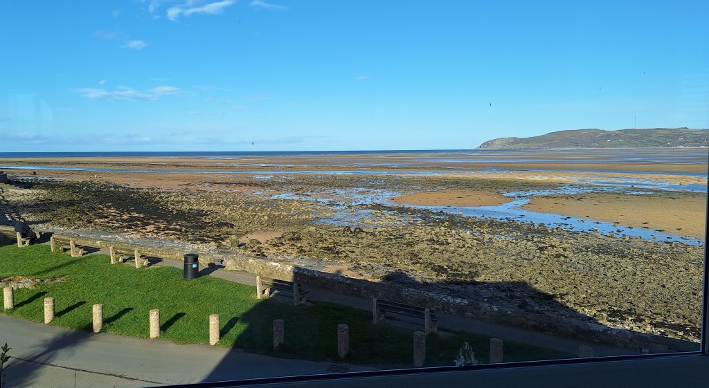 As we crossed the border into Wales, we saw our first red dragon. Soon after, we noticed some pink elephants. We watched as a herd of cows walked across the bridge over the road in front of us. And then, an old lady pussycat on the back of a bus that is the venue for afternoon teas. When we drove closer to the sea, we noticed a few white horses, it was that windy.