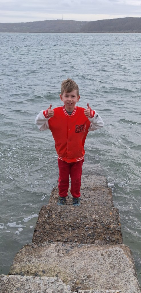 After a good night’s kip, and after a jolly good breakfast, including Coco Pops, we all went for a walk a bit further along the coast, starting near Moelfre. The cold wind came back, and was determined to find its way into my very sensitive lugholes. Other than that though, we had a good time. And yes, William probably walked and ran twice as far as anyone else.