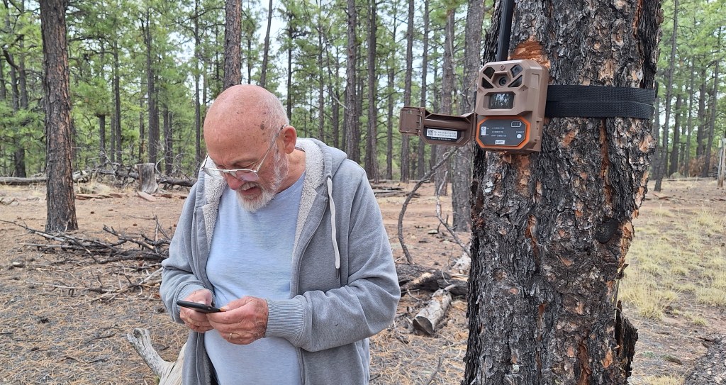 The most interesting job though was to affix a Moultrie Edge cellular trail camera to a tree, facing the cabin, so that from home in Albuquerque, Neil can keep an eye on the cabin and monitor the weather.